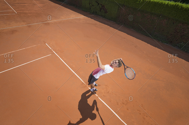 Young male tennis player serving the ball on sunny red tennis court, Bavaria, Germany