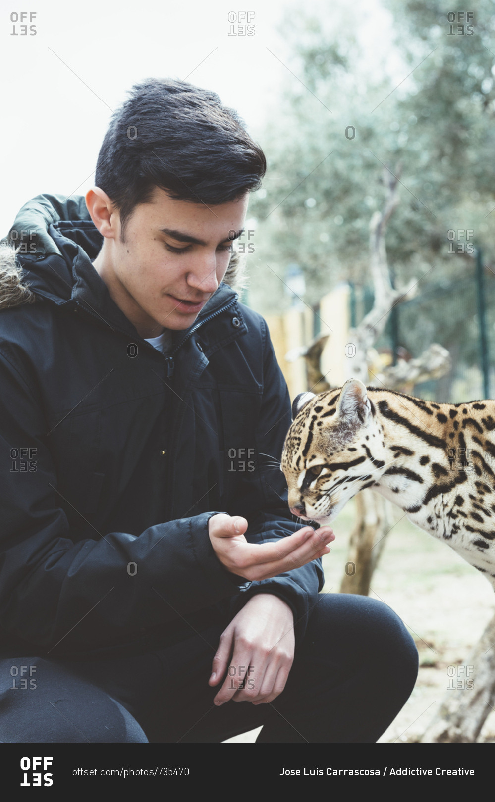 Young man feeding leopard cat from hand in the zoo.