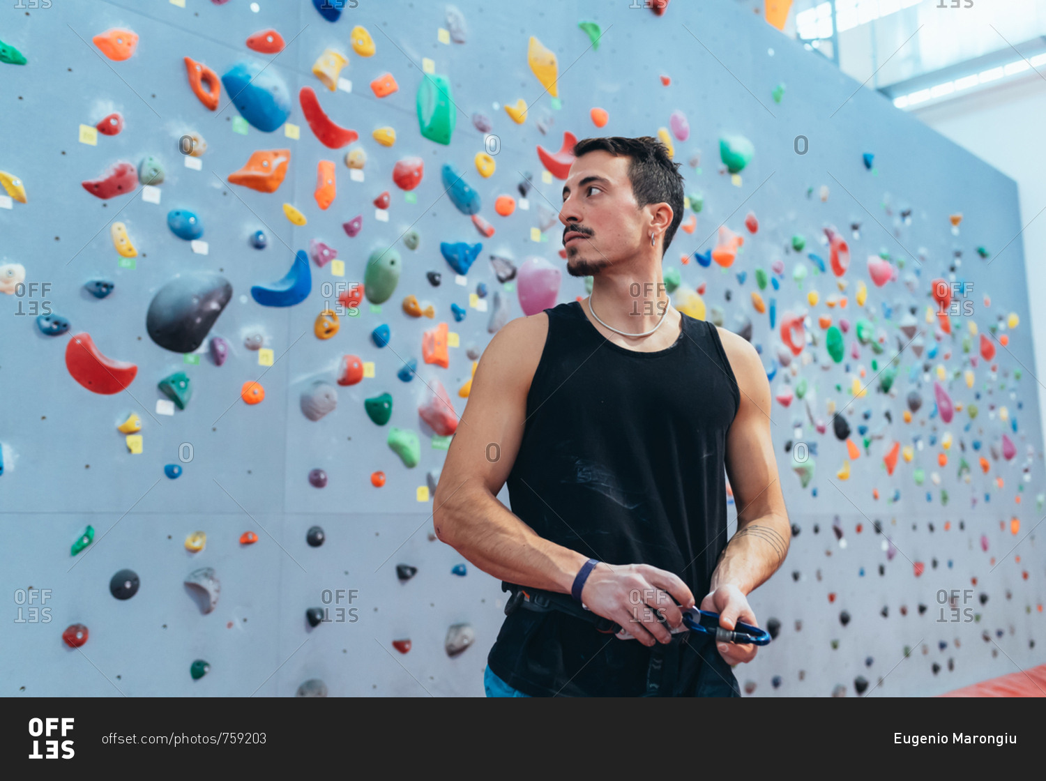 Young man preparing the wall for climbing in the gym - preparation, concentration, sportive concept