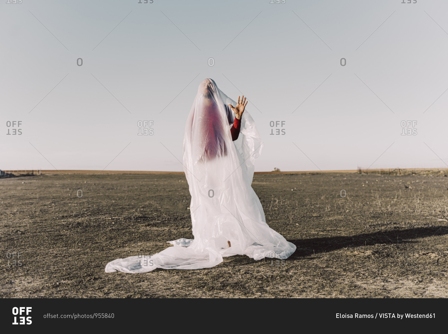 Young man standing in barren land trapped in a plastic foil