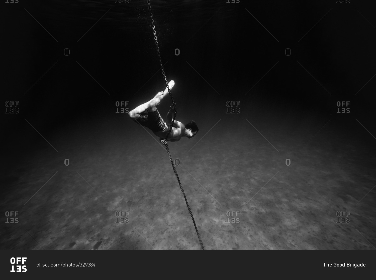 Young man underwater holding onto the anchor chain of a boat