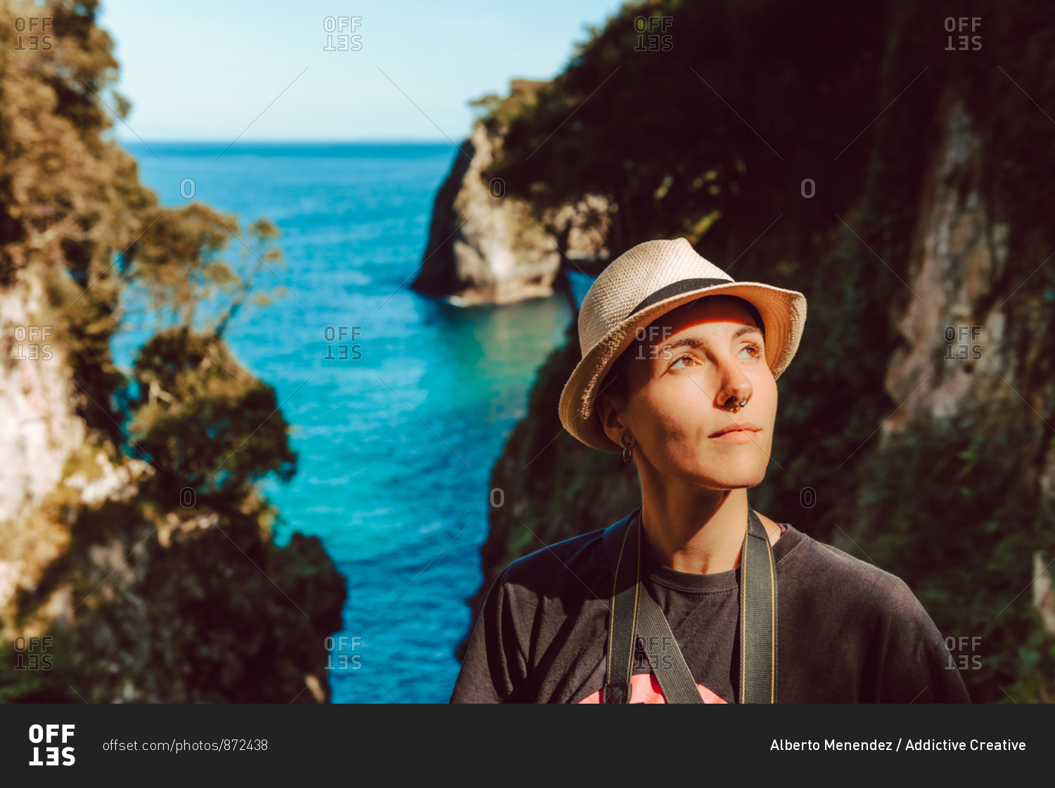 Young woman in hat standing with camera hanging on neck and enjoying picturesque view of sea and rocks in Ribadedeva Asturias Spain