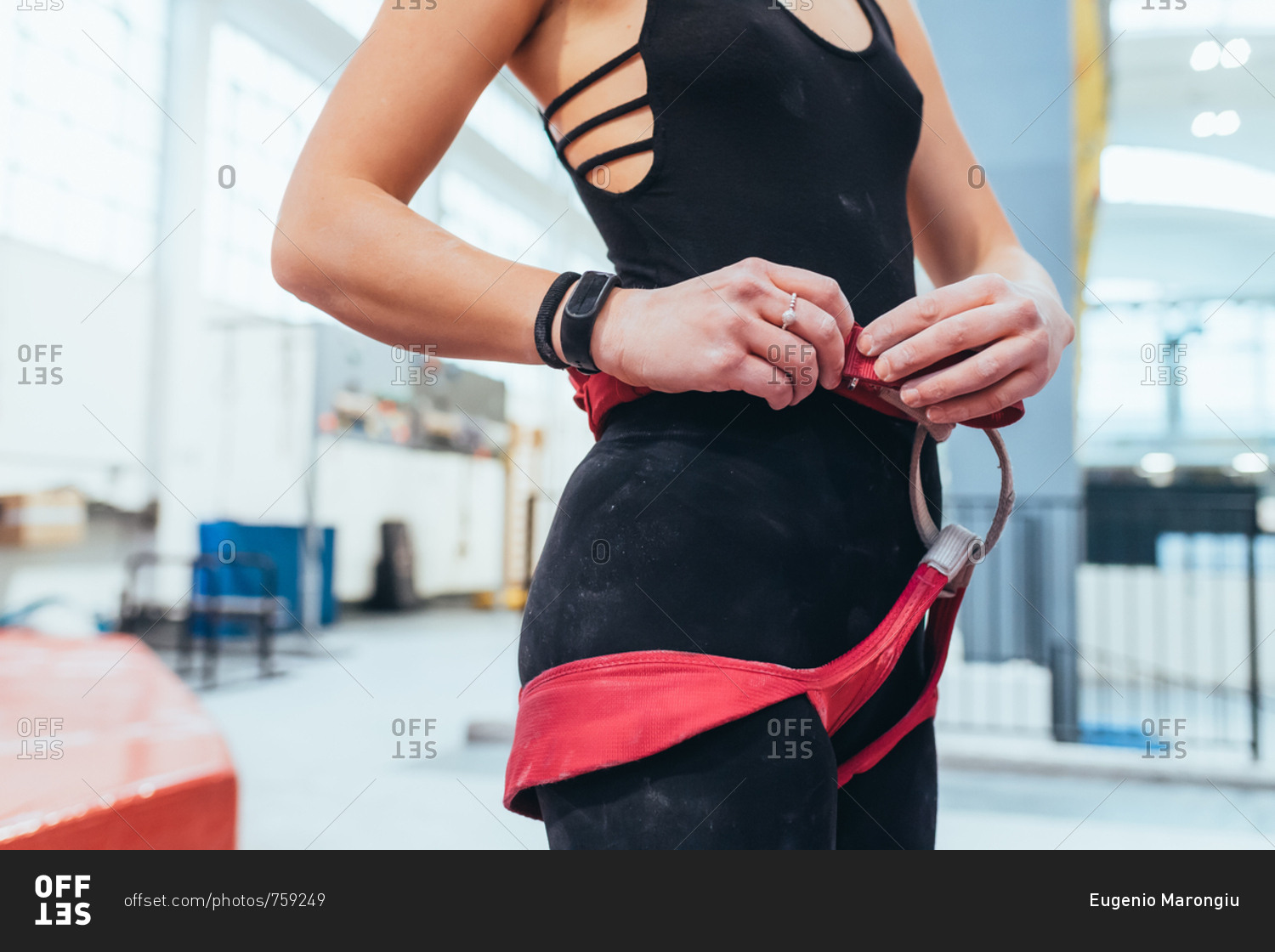 Young woman preparing himself in a climbing gym - preparation, concentration, sportive concept