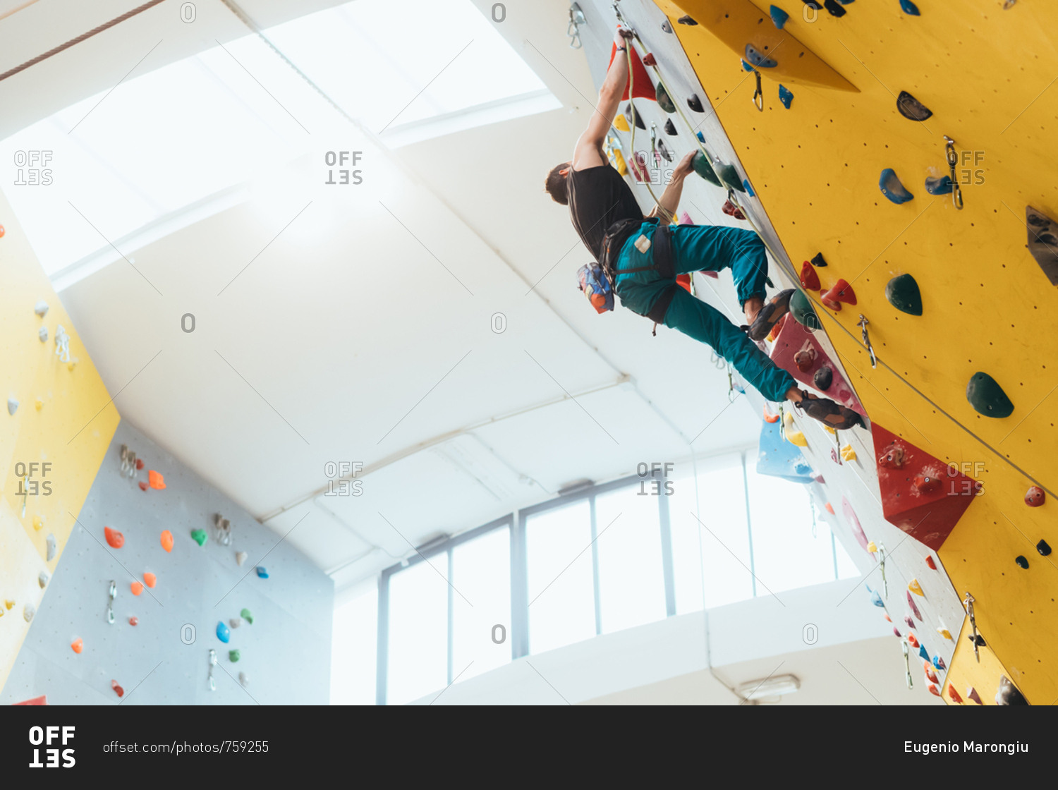 Young woman preparing himself in a climbing gym - preparation, concentration, sportive concept